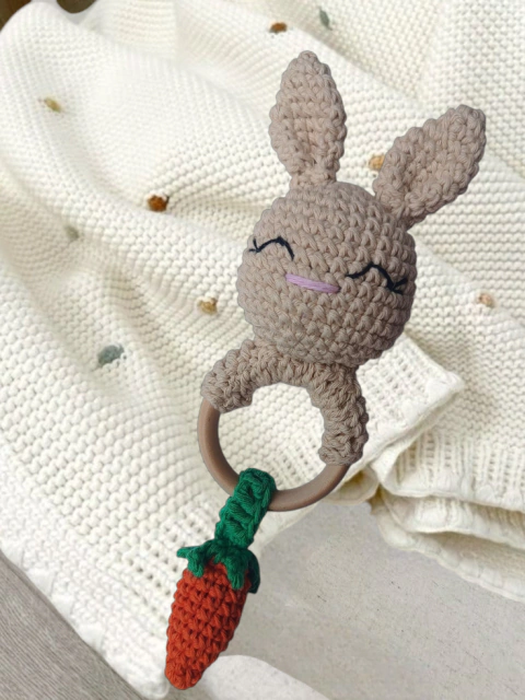 SONAJERO CON FORMA DE CONEJITO, CONFECCIONADO EN ALGODON HIPOALARGENICO. NO GENERA MOLESTIAS EN LA PIEL. IDEAL PARA PRIMEROS JUGUETES DEL BEBE.
