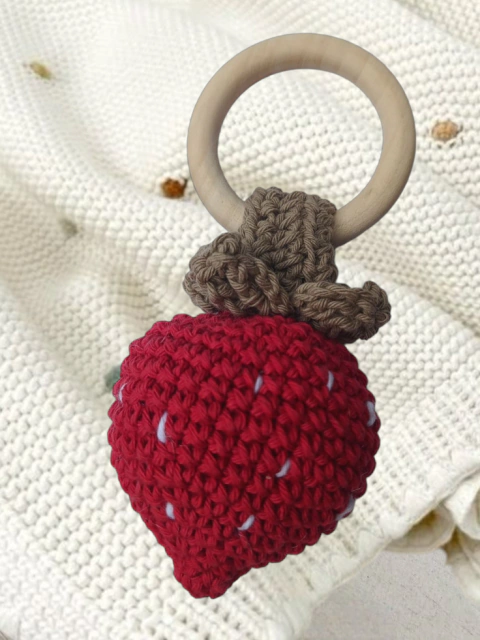 SONAJERO CON FORMA DE FRUTILLA, CONFECCIONADO EN ALGODON HIPOALARGENICO. NO GENERA MOLESTIAS EN LA PIEL. IDEAL PARA PRIMEROS JUGUETES DEL BEBE.