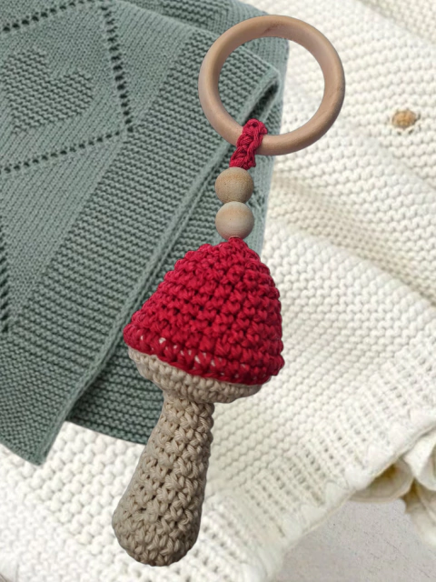 SONAJERO CON FORMA DE HONGUITO, CONFECCIONADO EN ALGODON HIPOALARGENICO. NO GENERA MOLESTIAS EN LA PIEL. IDEAL PARA PRIMEROS JUGUETES DEL BEBE.